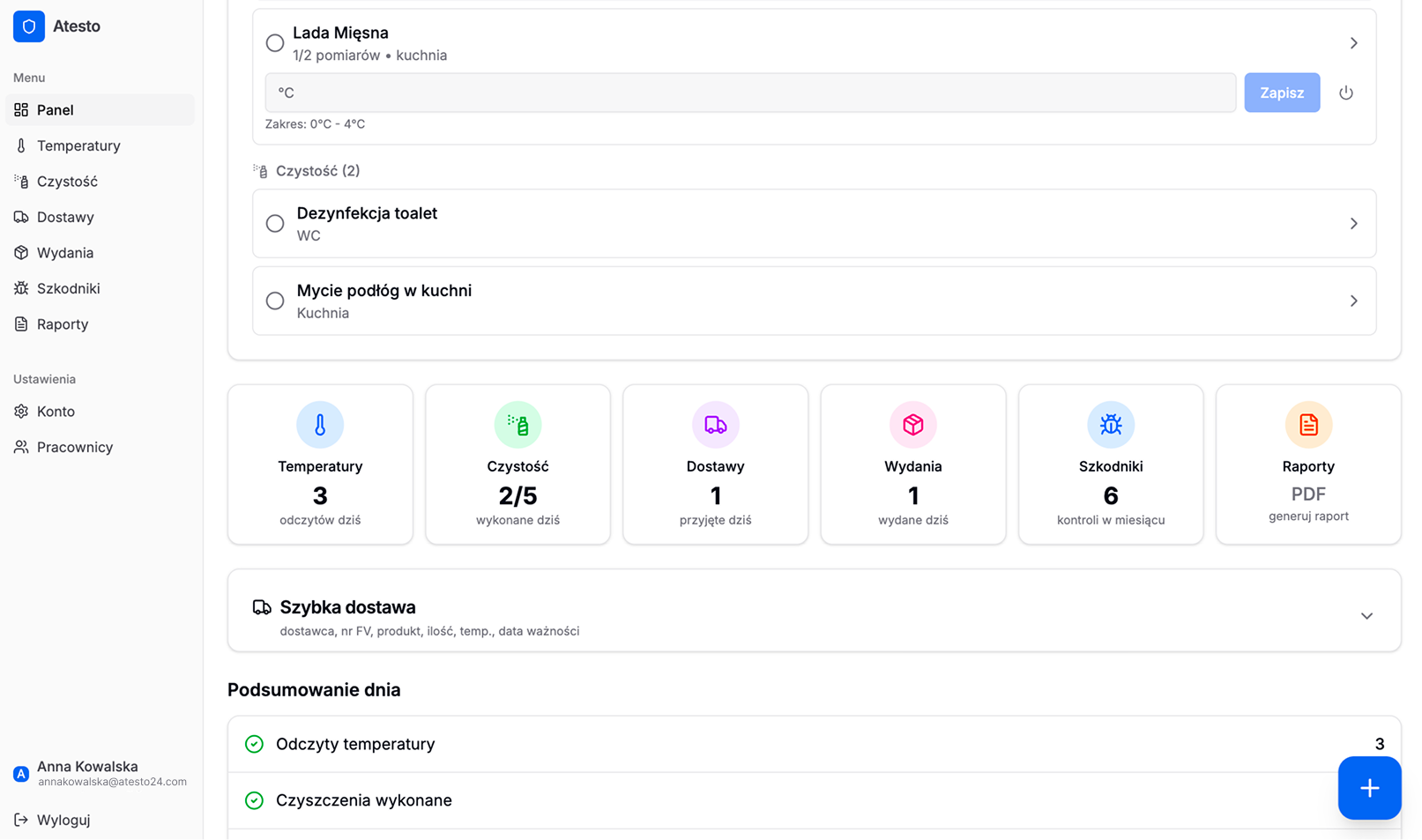 Jeśli prowadzisz mały lokal sam i masz 1-2 lodówki — papier wystarczy. Ale jeśli masz kilku pracowników, więcej urządzeń, albo po prostu nie chcesz szukać kartek przed kontrolą — sprawdź jak to wygląda w Atesto.